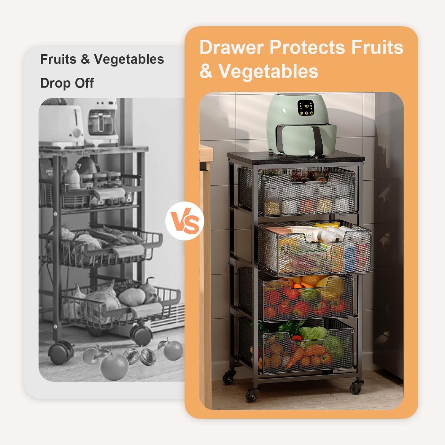 4-Tier Fruit Vegetable Storage Cart - Kitchen Organizer and Storage Cart with Wheels, Wooden Top Metal Wire Fruit Vegetable Rack Stand with Drawers to Storage Cans Snacks for Kitchen(Patent Pending)