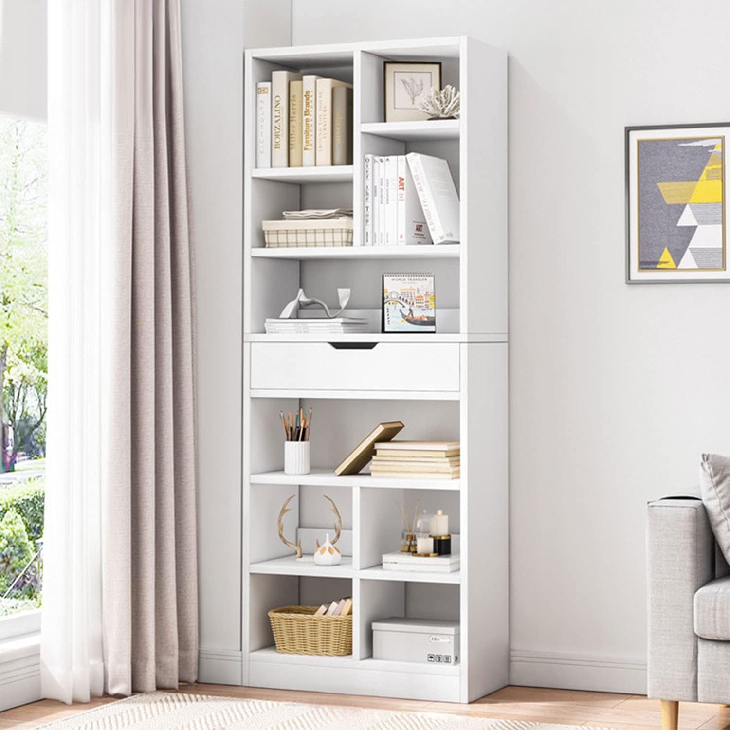 IOTXY Wooden Open Shelf Bookcase - 71 Inches Tall Freestanding Display Storage Cabinet Organizer with 10 Cubes and a Drawer, Floor Standing Bookshelf in Warm White