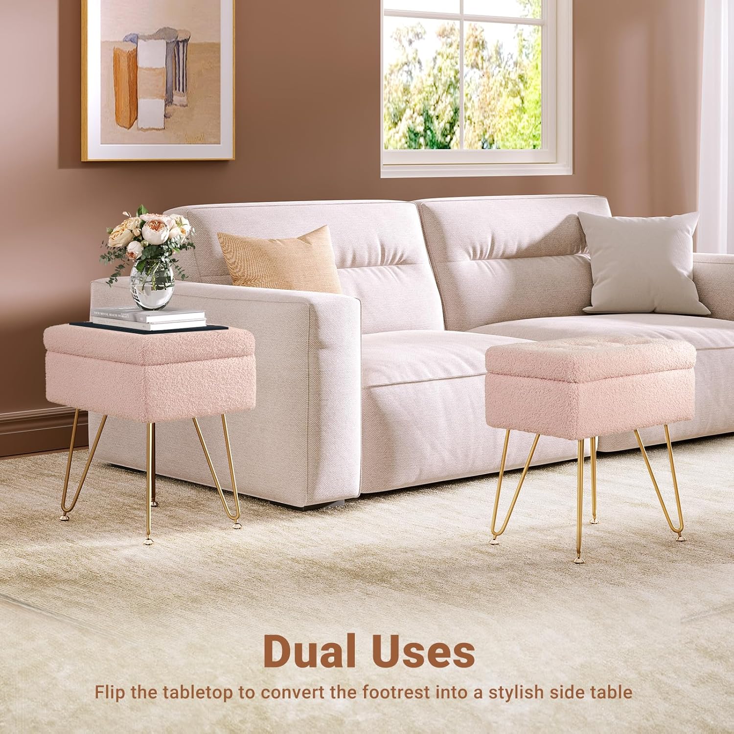 Seventable Vanity Stool Chair with Storage, Teddy Velvet Soft Ottoman, 4 Metal Legs with Anti-Slip Feet, Furry Padded Seat, Multifunctional Stool for Makeup, Footstool, Bedroom, Pink